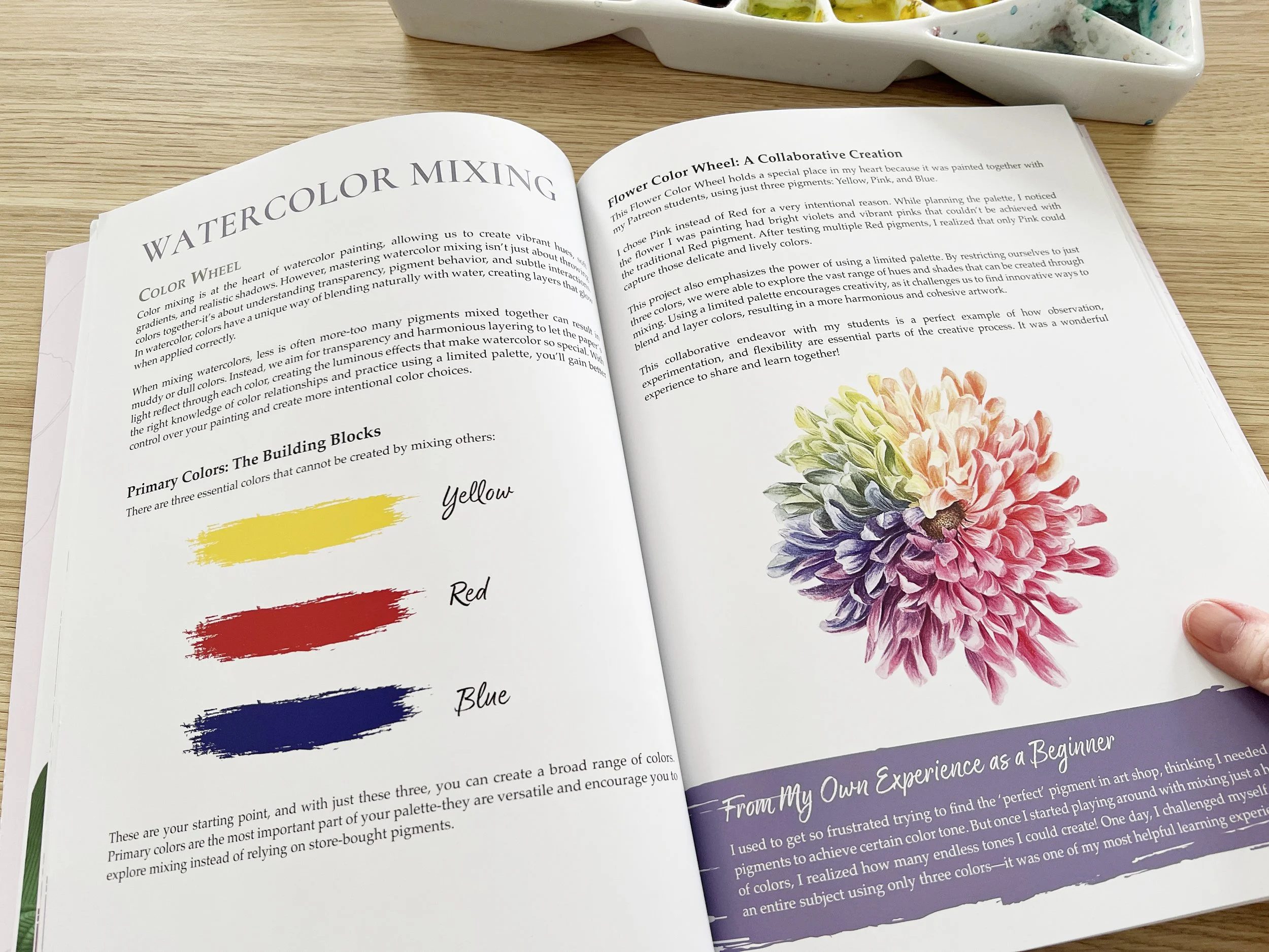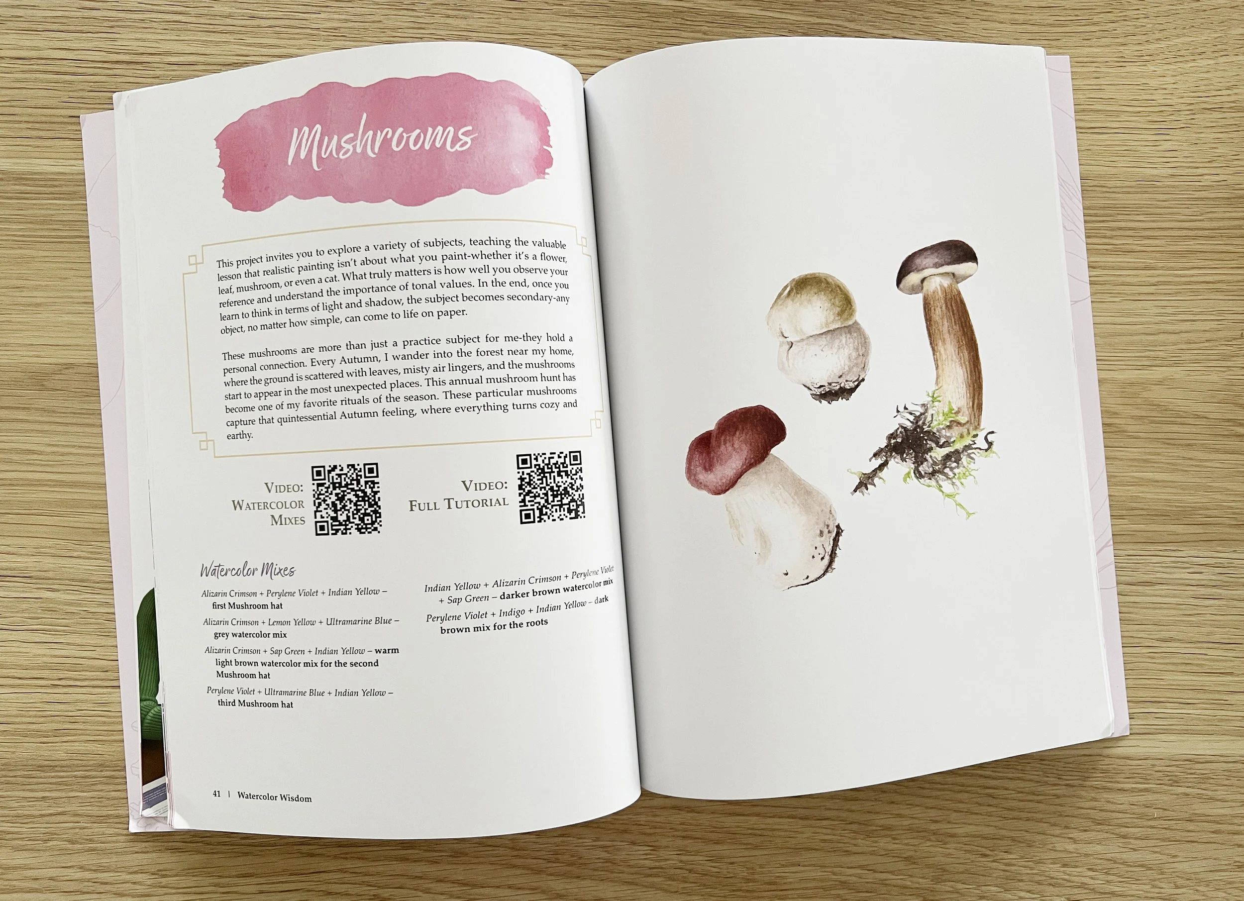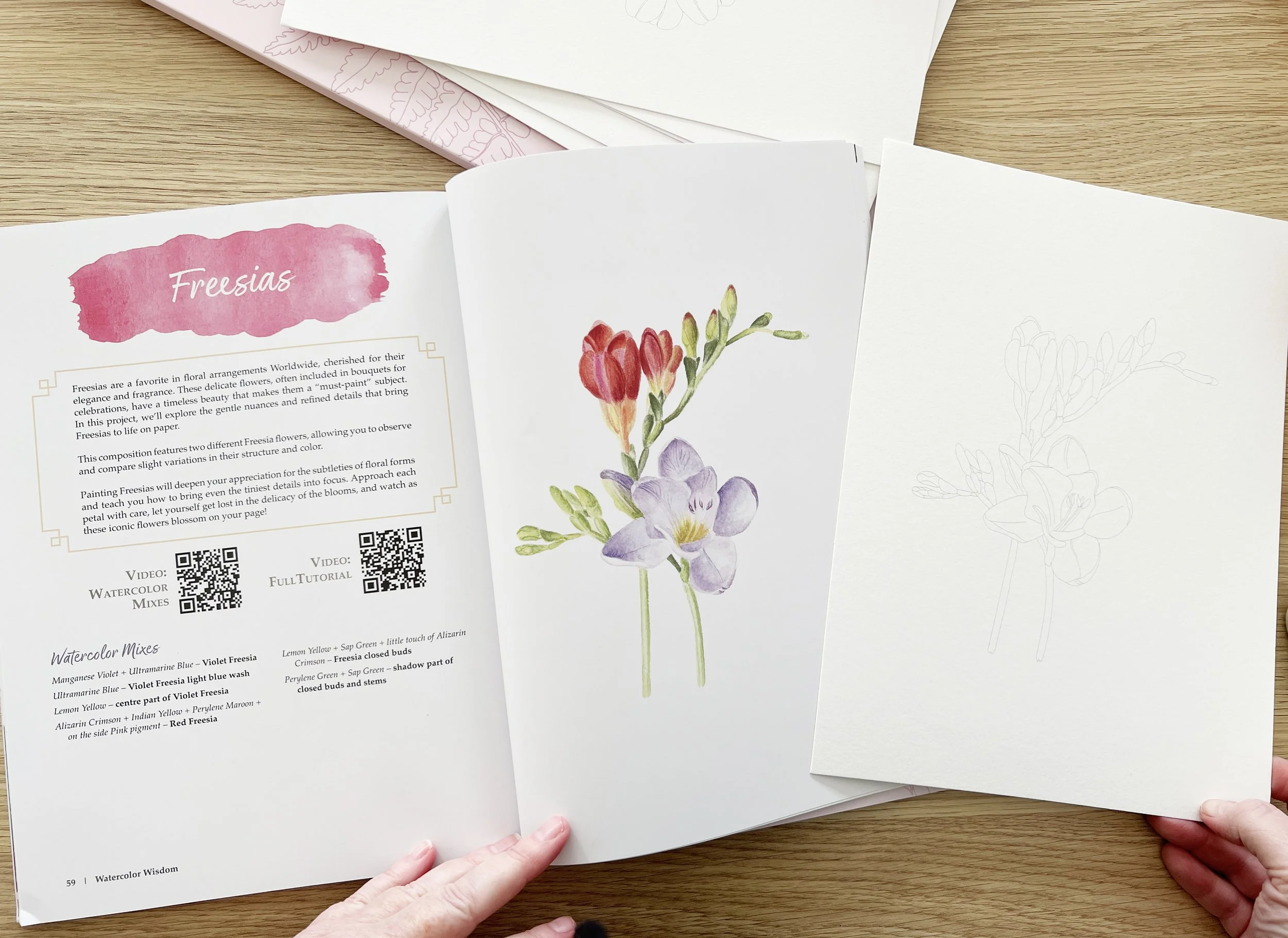 Watercolor Wisdom is built around 15 botanical projects, each designed to help you explore a specific concept or technique. For each one, you’re given a printed line drawing on hot press watercolour paper so you can paint directly onto the page. There are no written step-by-step instructions - instead, each project includes two QR codes: one links to a full video tutorial of the painting process, and the other shows the colour mixing for that piece.