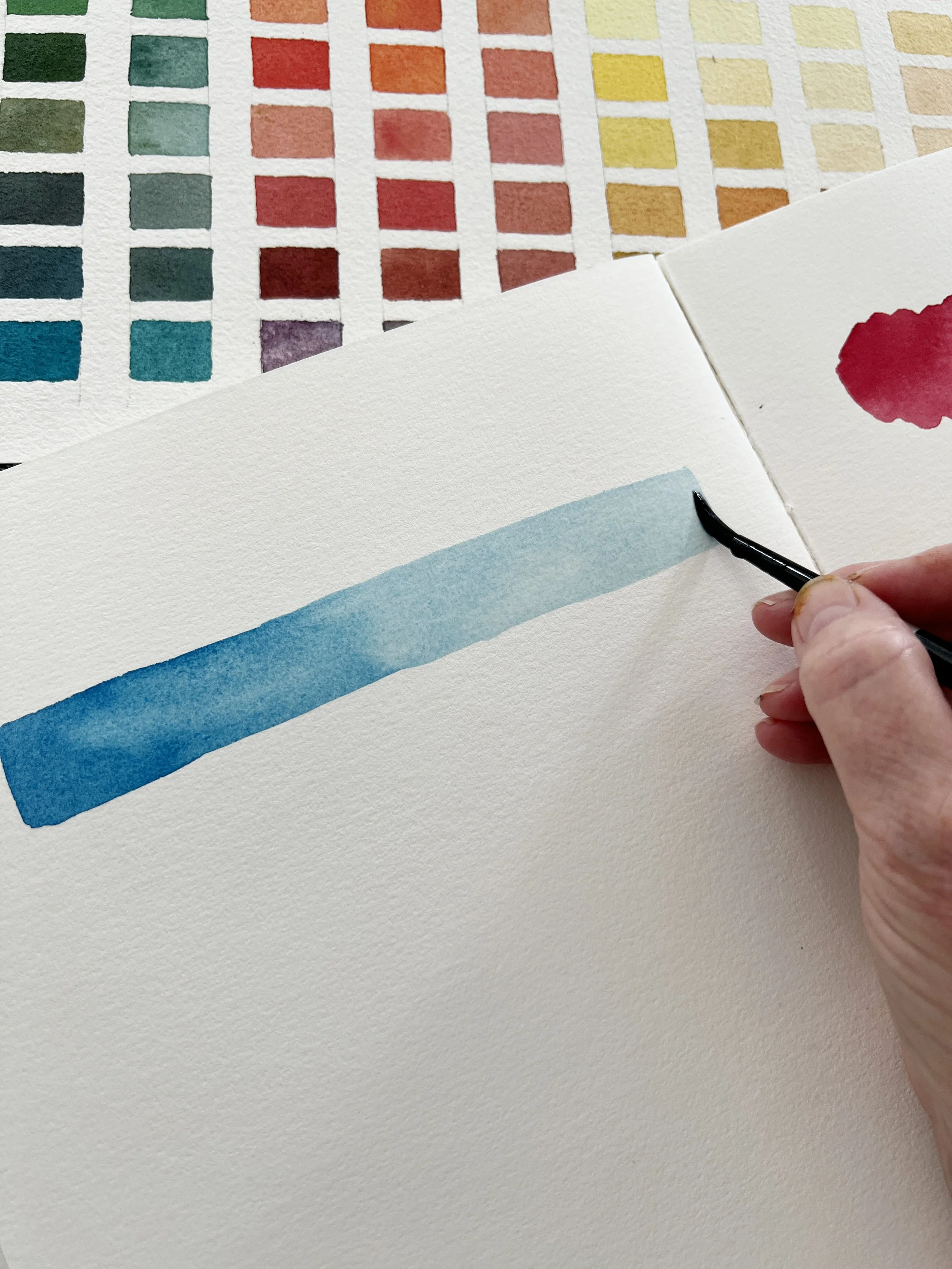 Beside your chart, create a small value strip for each colour, from full strength to the palest wash. It’s astonishing how much range even a single pigment has. Prussian Blue, for example, can move from nearly black to the softest misty blue-grey. These strips help you judge how much water to use for highlights versus deep shadows.