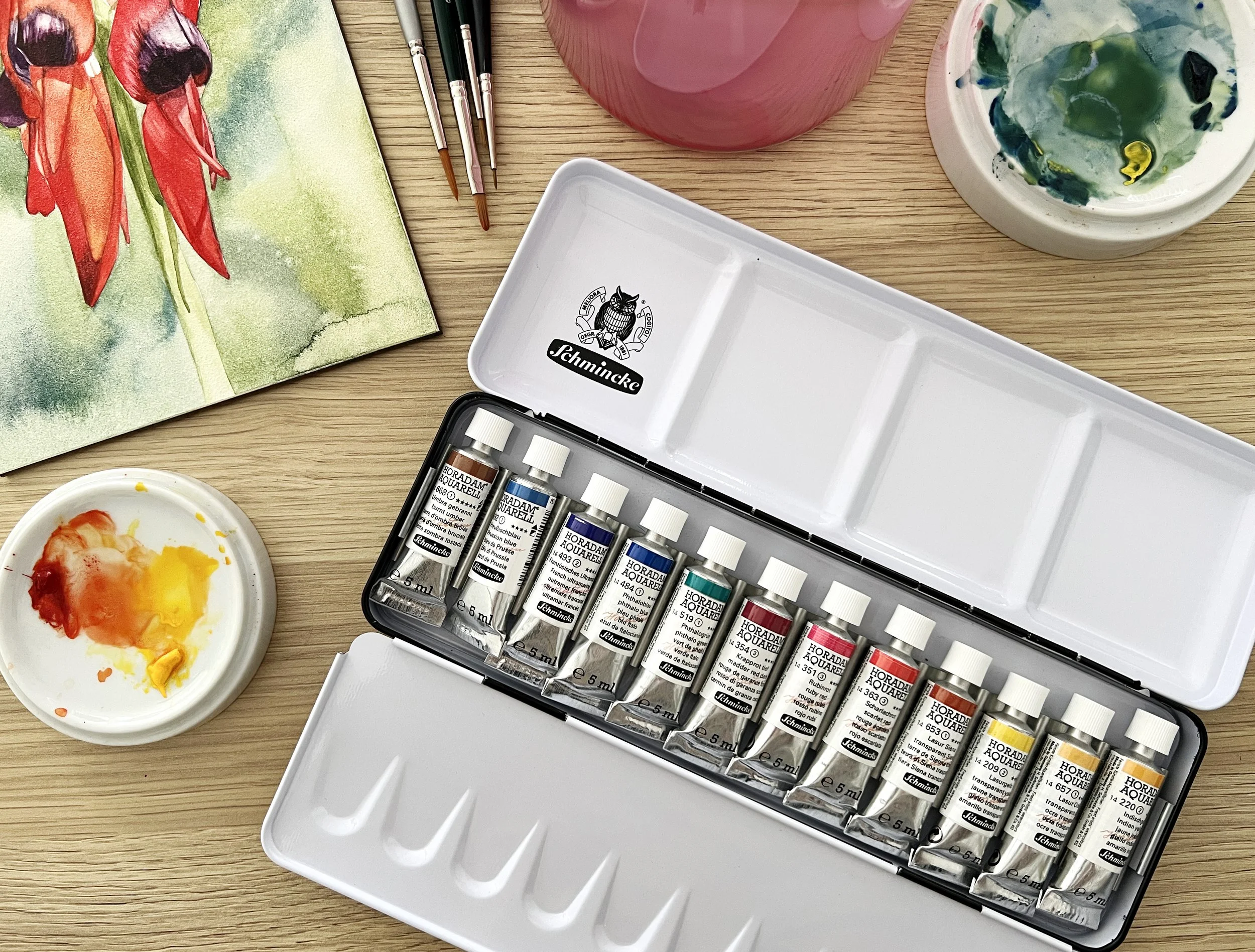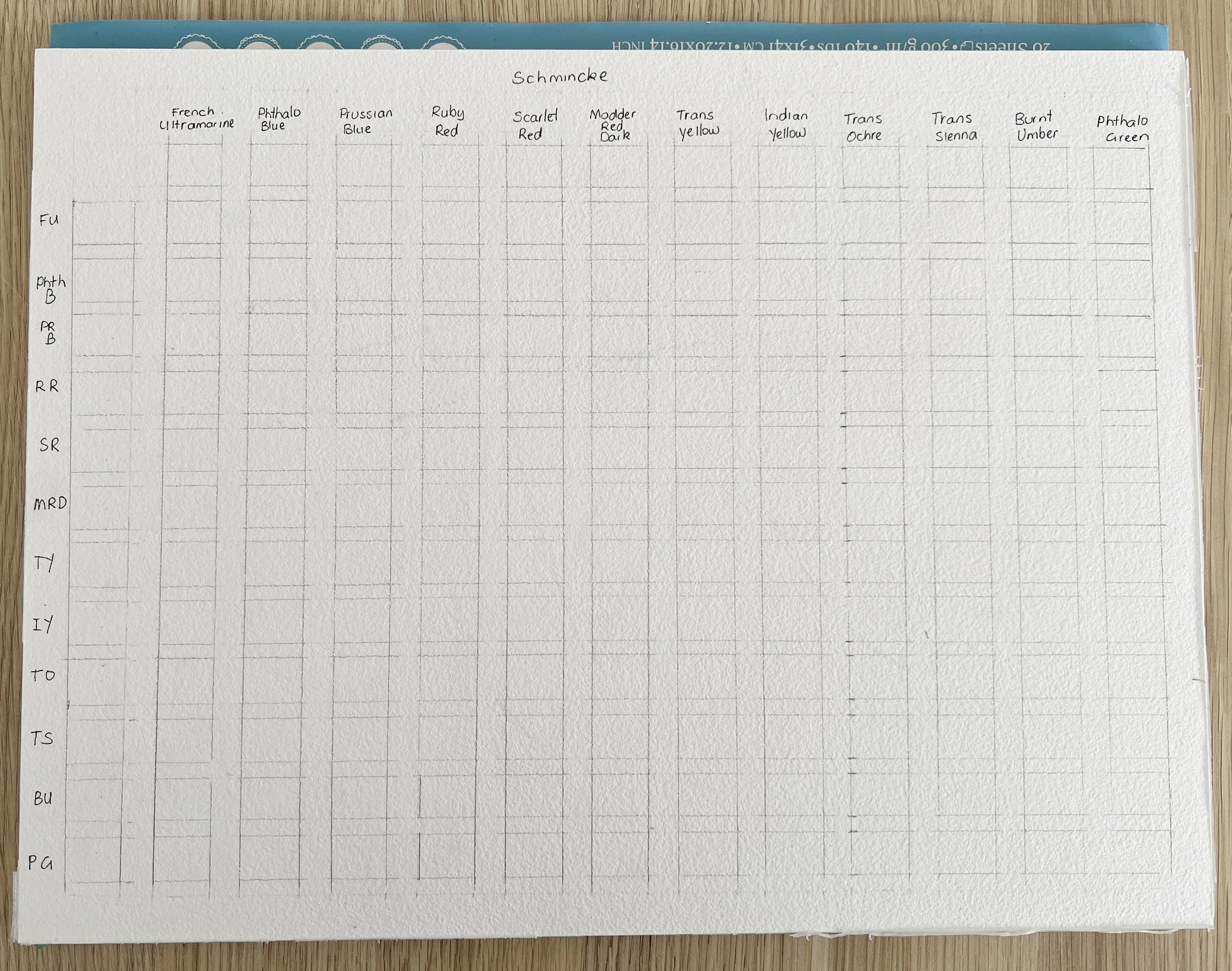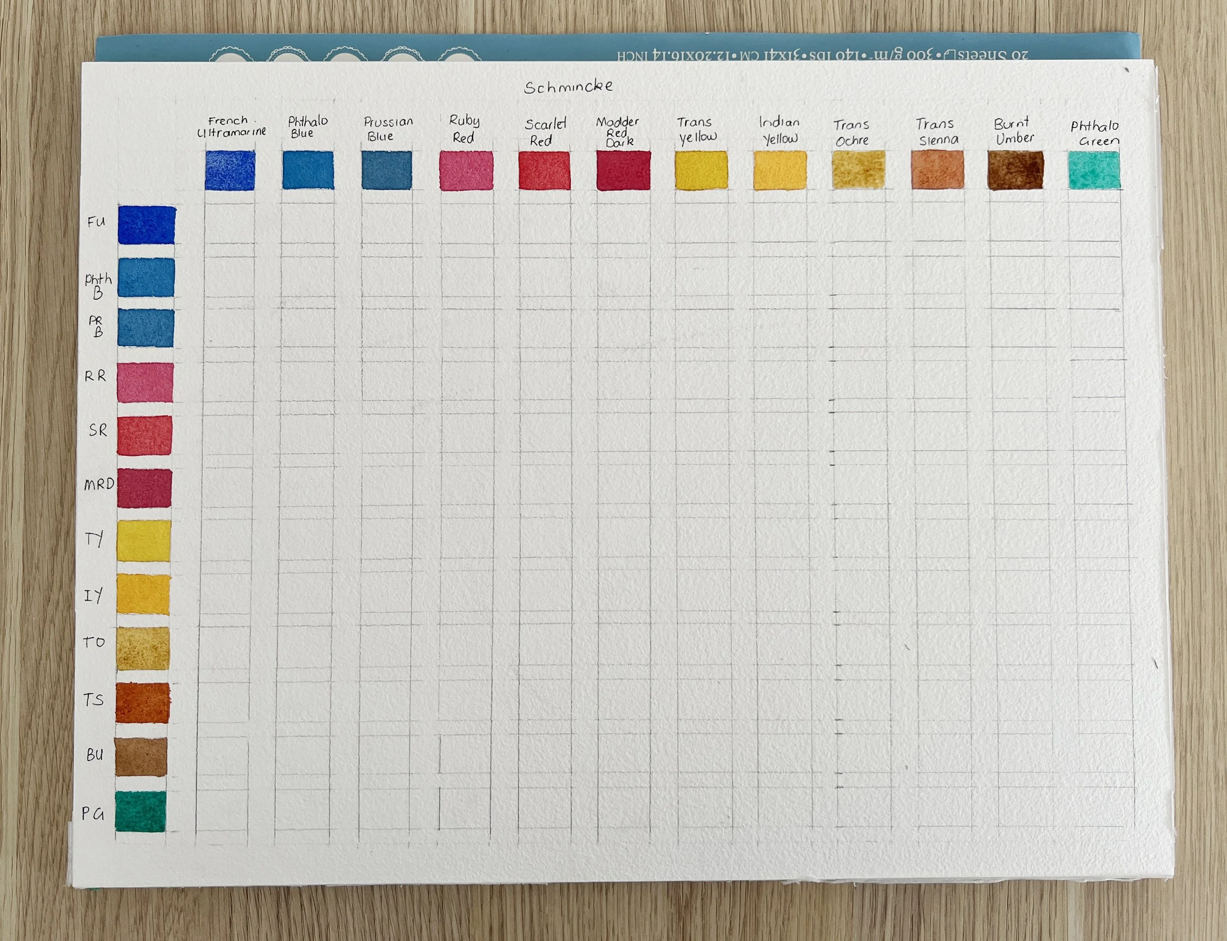 Today, I’m going to walk you through how to create your own watercolour mixing chart using the twelve colours from my custom Schmincke Horadam palette. This is the same set I use in most of my paintings, and I’ll show you how to record the beautiful interactions between these pigments so that your chart becomes a tool you’ll refer to again and again.