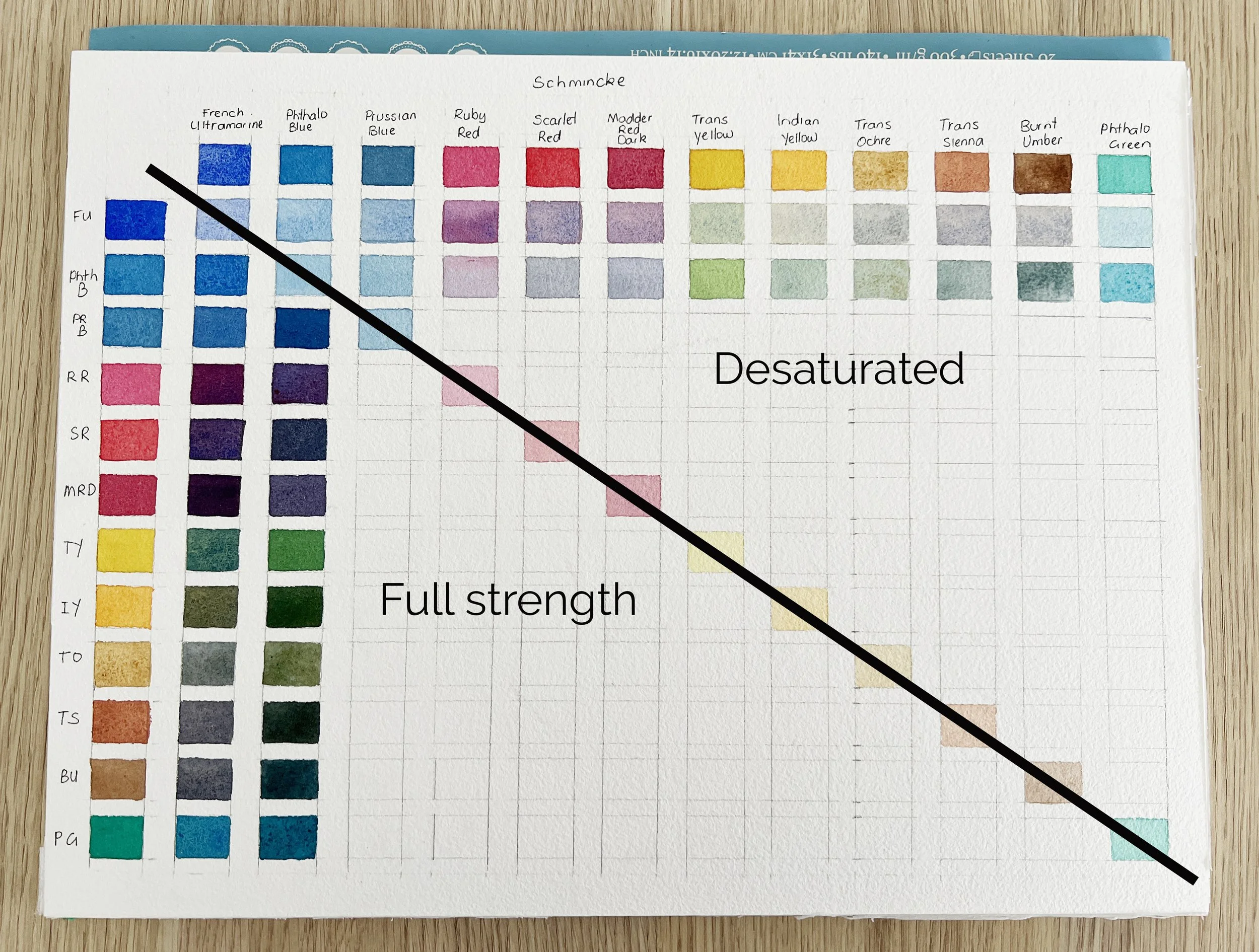Because the same mixtures appear twice on the chart - the mixtures on the left side (under the diagonal line) are painted at full strength, while the mixtures on the right (on top of the diagonal line) are thinned with some water. This lets me compare how each combination looks when it’s rich and saturated versus when it’s lighter and more transparent.