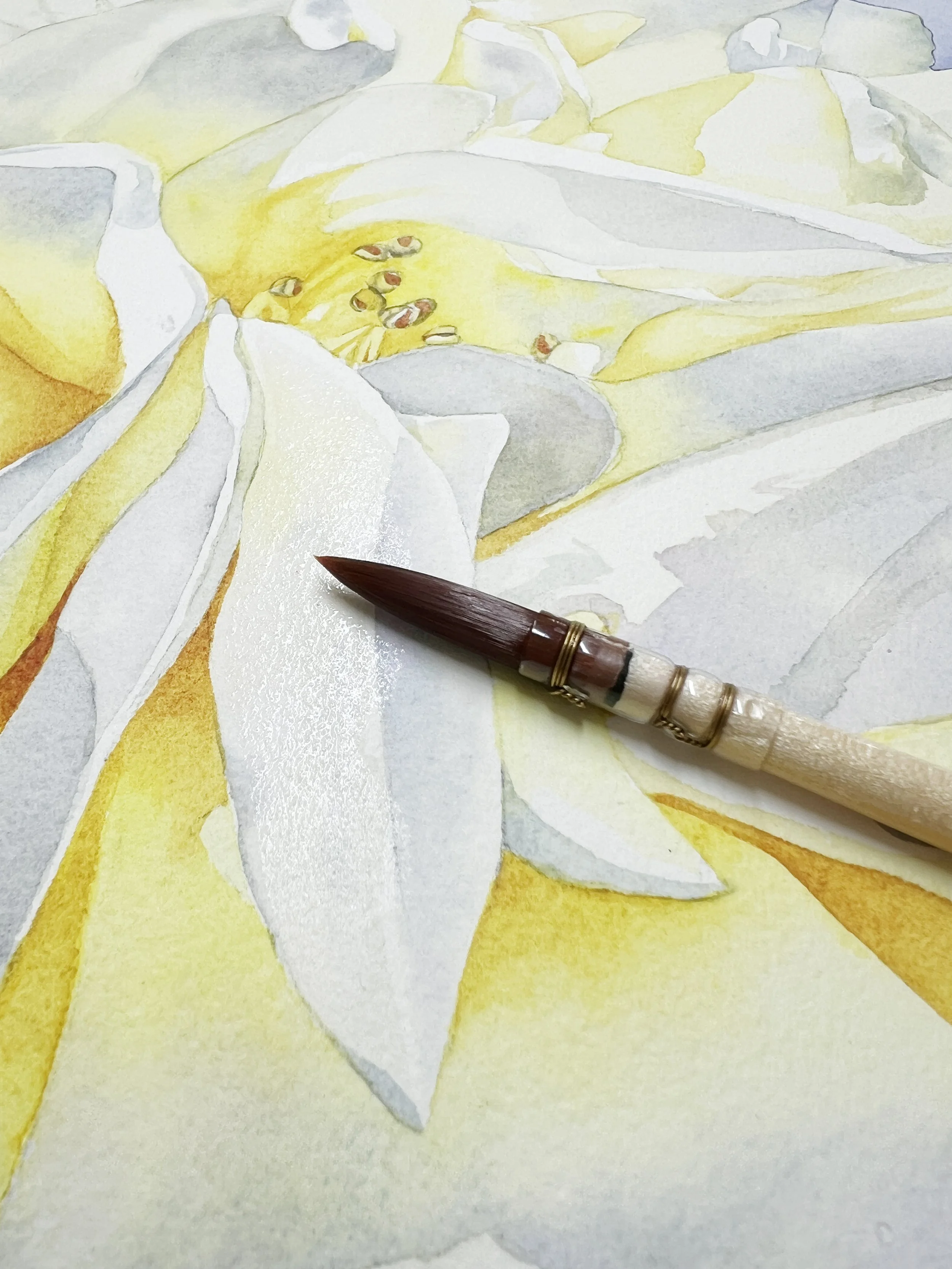 When I’m working on a big painting, I break it down into manageable sections, especially when I’m laying in broad washes or background areas. Instead of wetting the whole sheet, which can be stressful and hard to control, I wet only the part I’m ready to paint. This gives me time to focus on just that area, blending and shaping the wash without it drying too quickly or running into areas I’m not finished with yet.