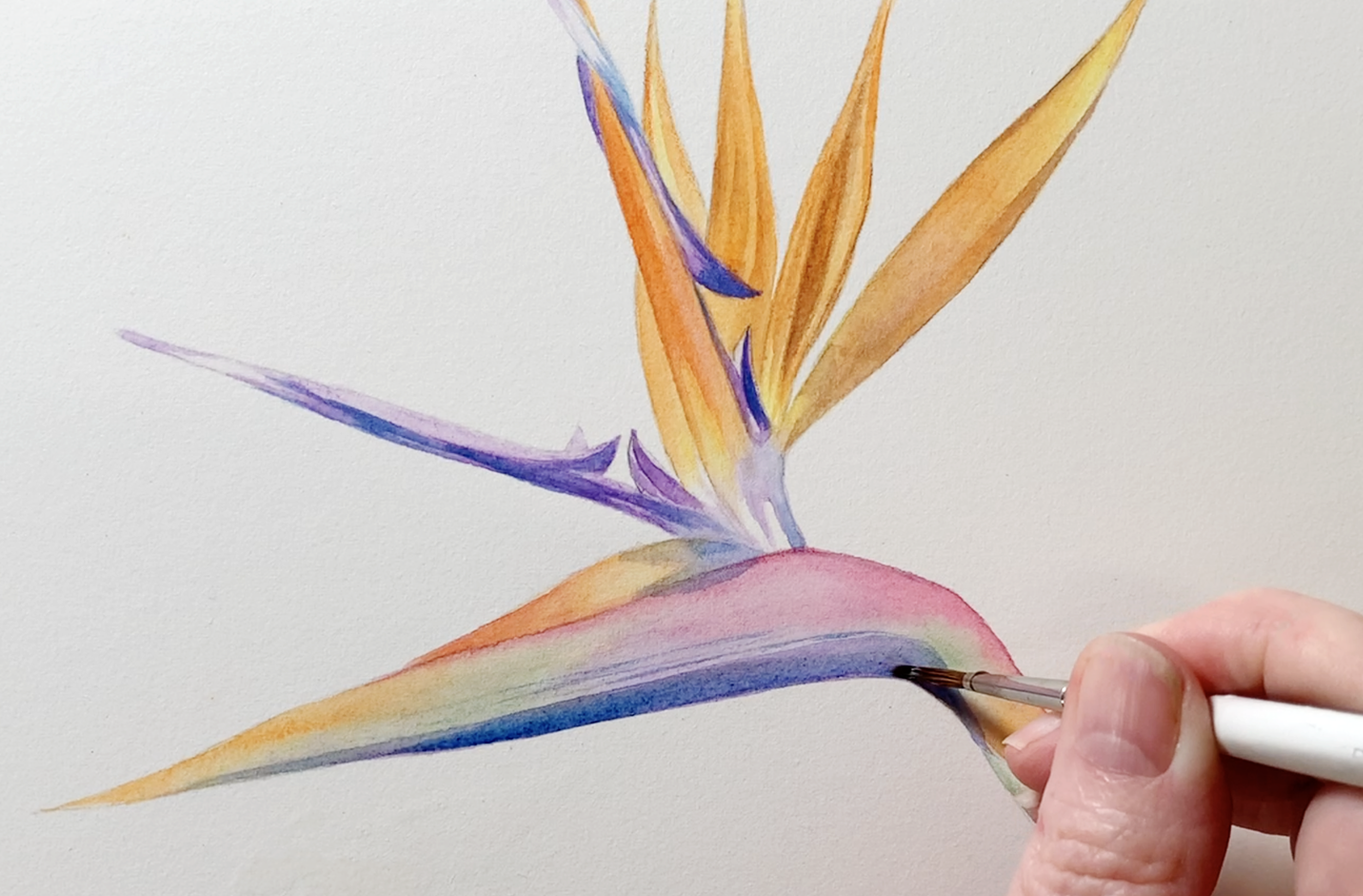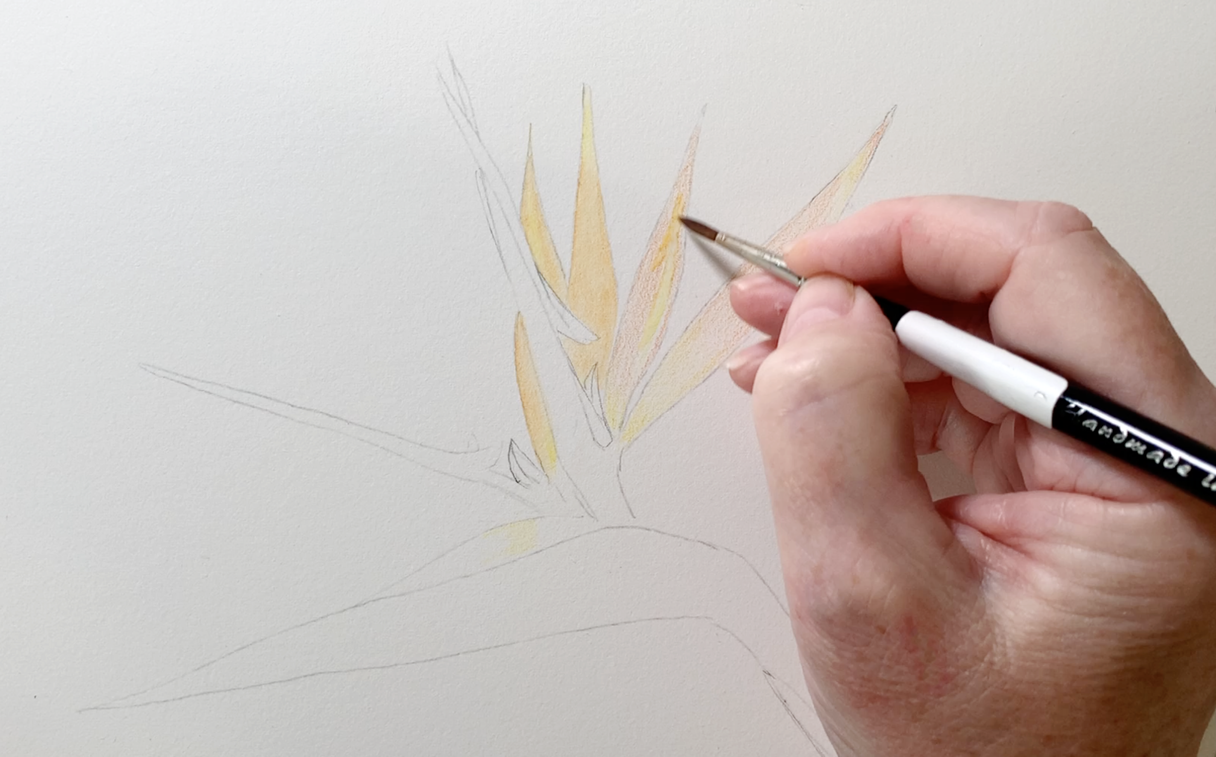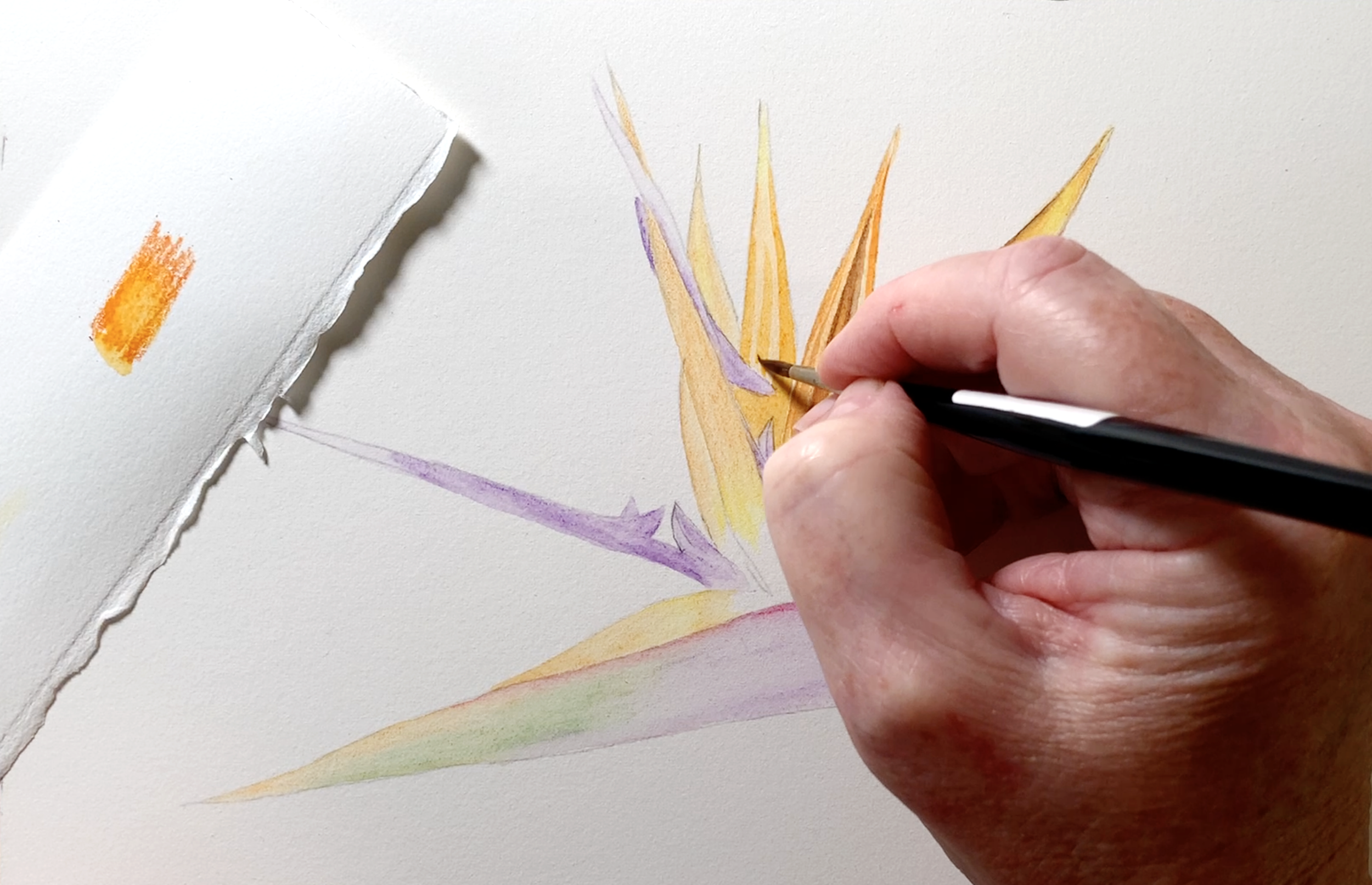 Just like with watercolours, depth comes from layering. I gradually deepened my Bird of Paradise painting by adding more pigment, sometimes drawn lightly onto the paper, sometimes brushed on from the pencil tip, and sometimes wet on wet.
