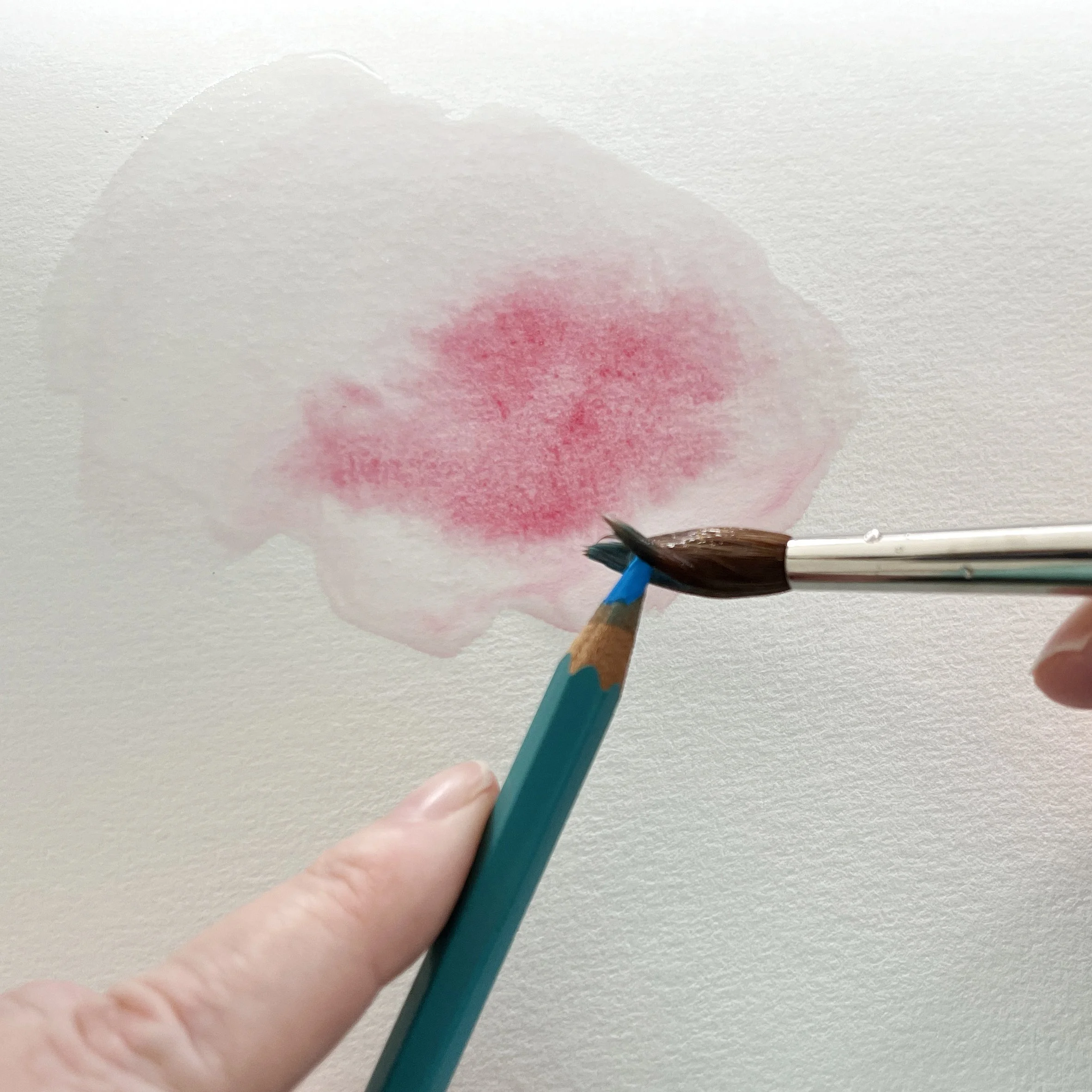 Picking up pink pigment from a watercolour pencil with a wet brush.