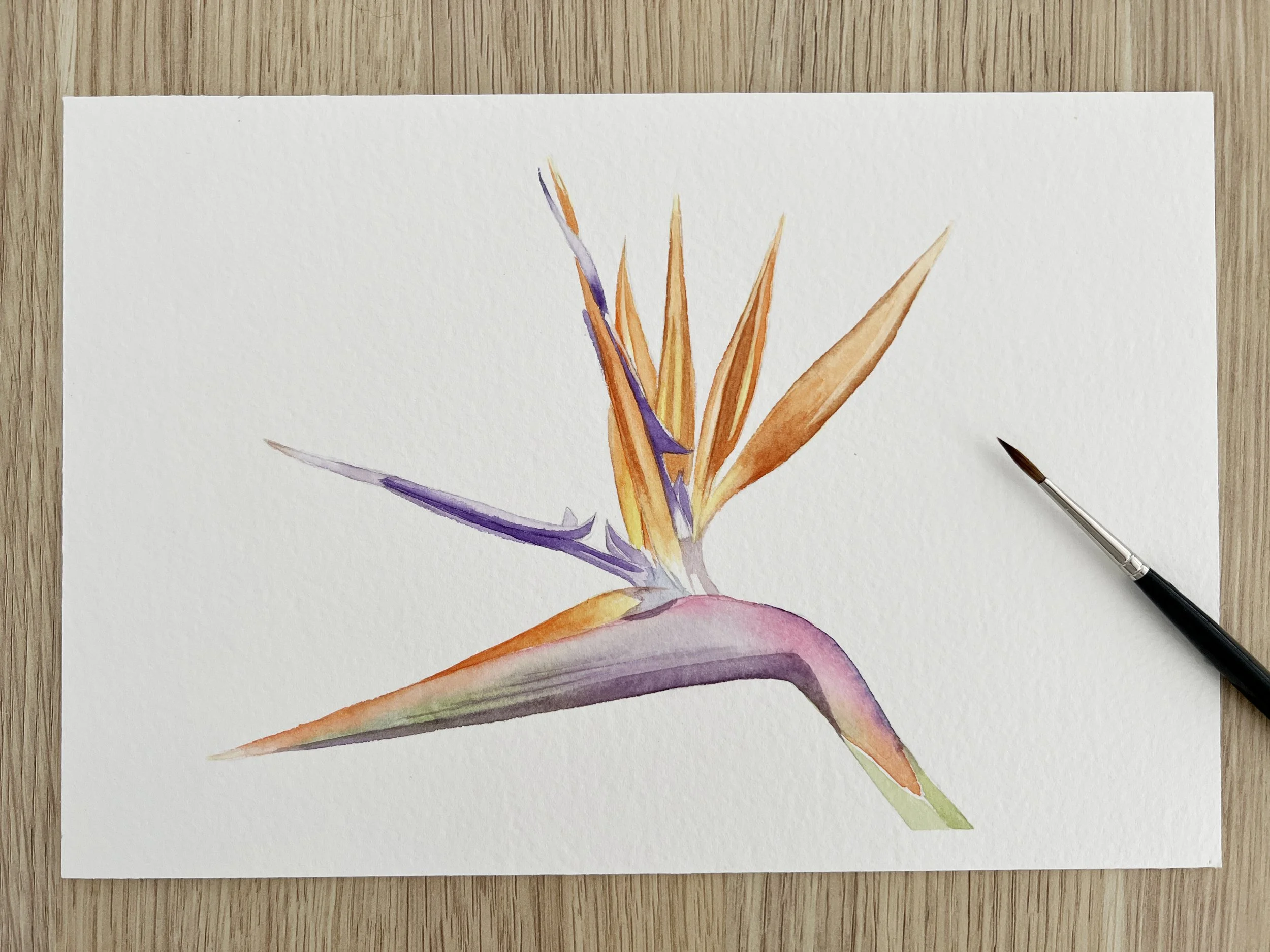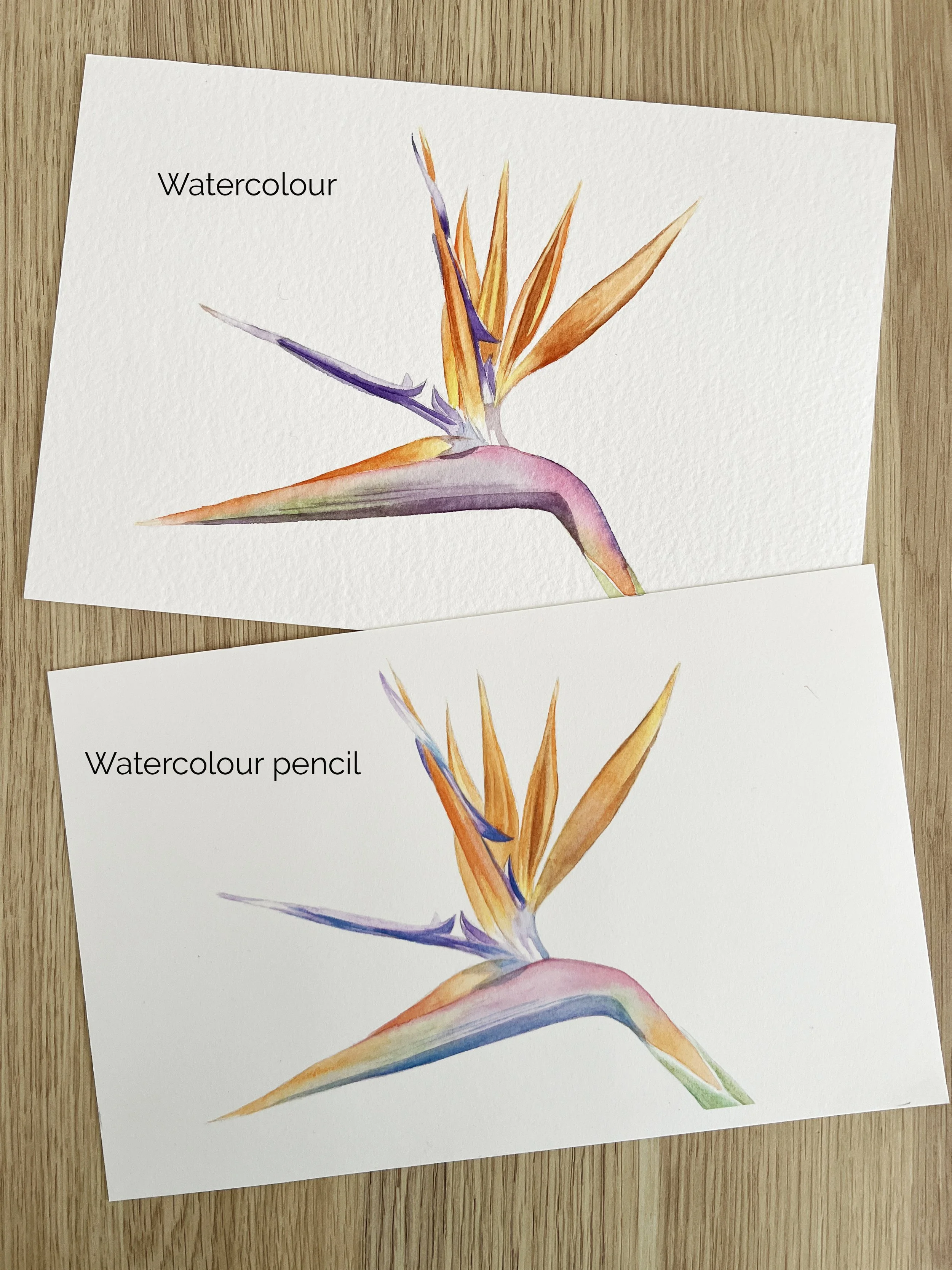 I don’t often reach for my watercolour pencils, but every now and then curiosity (and requests from you!) push me to dust them off. Recently I decided to experiment with them properly. I painted a Bird of Paradise flower using only watercolour pencils, and for comparison, I painted the same subject in traditional watercolour paints as well.